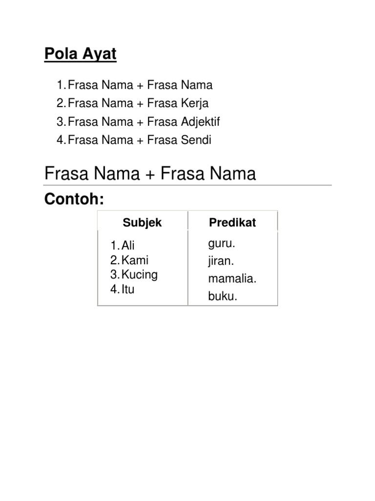 Kata adjektif juga dikenali sebagai kata sifat ialah kata yang menjadi inti dalam frasa adjektif seperti manis sekali sudah lama sungguh masih lebat lagi. Kata nama ialah perkataan yang boleh menjadi unsur inti bagi binaan frasa namaSelalunya perkataan demikian menamakan orang haiwan tempat benda atau konsep. Predikat ayat terdiri daripada frasa nama frasa kerja frasa adjektif dan frasa sendi nama.